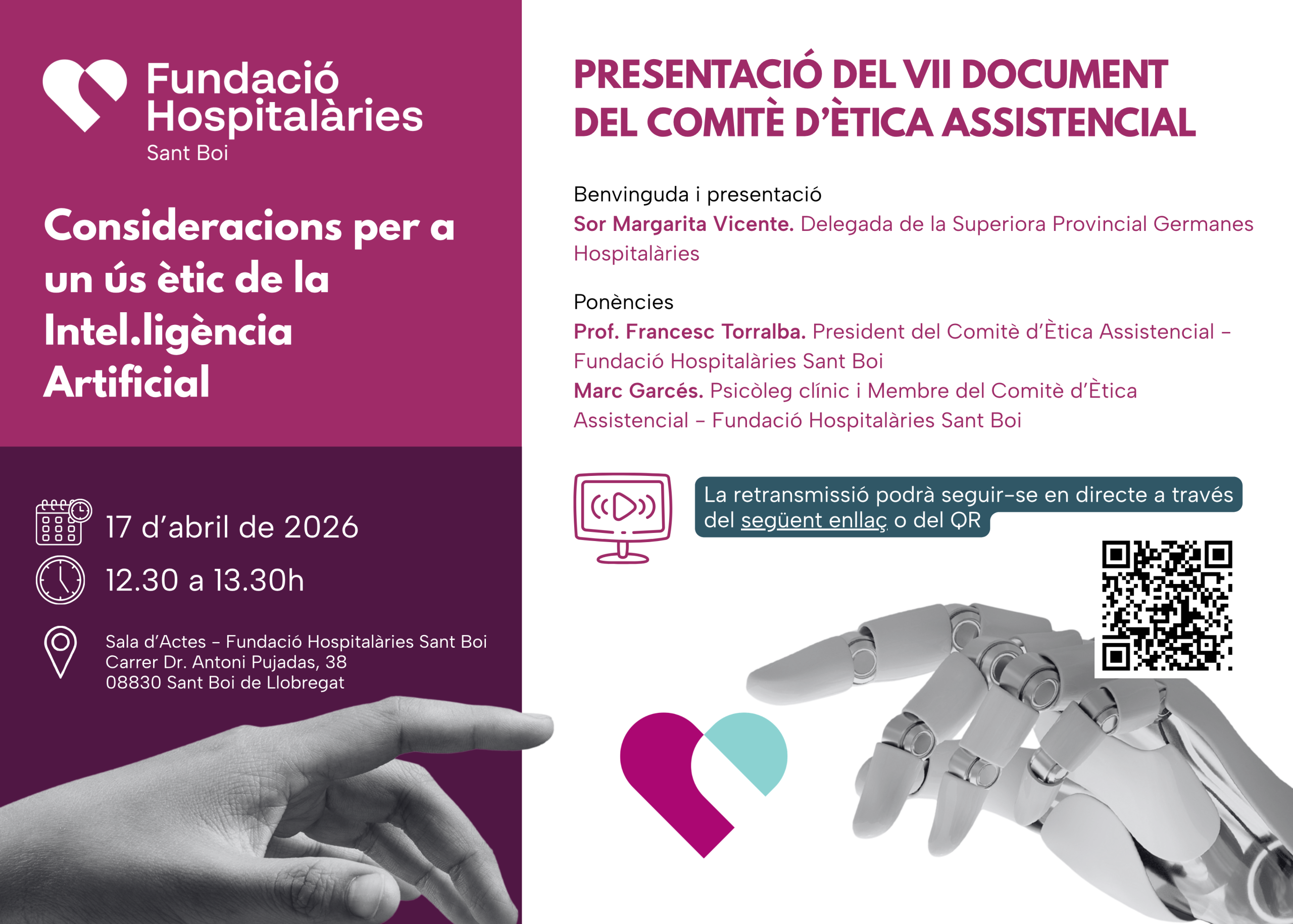 El pròxim divendres, 17 d'abril, celebrarem la presentació del VII Document del Comitè d’Ètica Assistencial de la Fundació Hospitalàries Sant Boi: "Consideracions per a un ús ètic de la Intel·ligència…