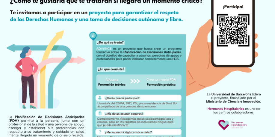 El proyecto ADVANCE tiene el objetivo de capacitar a usuarios, personas de apoyo y profesionales para poder elaborar correctamente una PDA. Está dirigido a usuarios y usuarias del CSMA, SRC y pisos-residencia de Sant Boi, acompañados de una persona de su entorno, como puede ser un familiar o amistad, y consiste en tres horas de formación teórica y una formación práctica orientada a crear una PDA personalizada por cada participante.